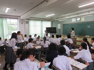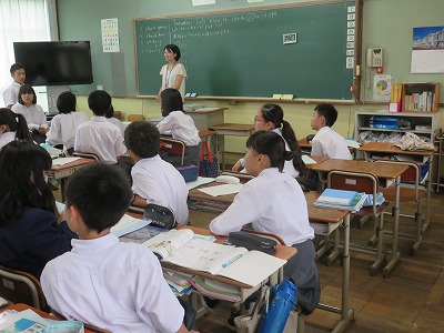 1年4組の英語の授業は,英語で相手に「〜しよう」と誘てみようという目標のもと,学習を深めました。