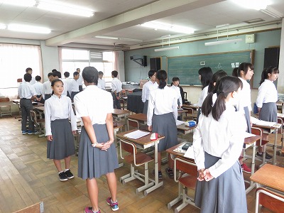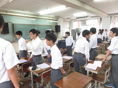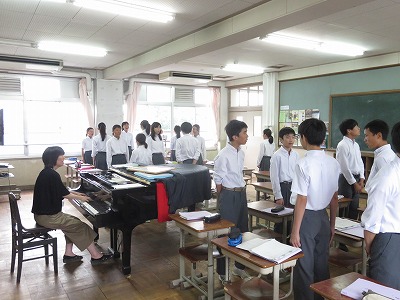 3年4組の音楽は,全体合唱「青春メモリーズ」と学年合唱「聞こえる」の練習をしていました。