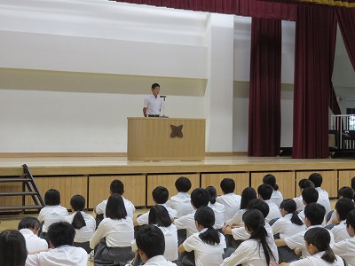 始業式では,学校長より「不安な気持ちで学校へ来ている人がいるかもしれません。人とのかかわりの中で,不安を解いていってほしい。」一方,「不安な気持ちの人がいないか周りの様子を見て,気になる仲間がいれば寄り添い,そして先生にも連絡をしてください。」また,「2学期は大きな行事が続きます。仲間との議論を深め,行事を創り上げる過程を大切にしてください。」と話がありました。