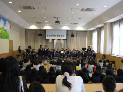 5月7日(土)樫原中学校吹奏楽部は14時から松陽児童館において訪問演奏会を行い子供たちと交流を深めました。初めての訪問先である松陽児童館で樫原中学校の代表にふさわしいさわやかな演奏を披露してくれました。最後に館長さんから「これで終わりとは思えません。ずっとこの時間が続くようです。ぜひまた来てください。」とお言葉を頂きました。たくさんの保護者の皆さんにも来ていただきました。有難うございました。また本日,野球部とソフトボール部の公式戦が行われました。野球部は岡崎球場で準々決勝に臨みました。チーム一丸となった懸命なプレーを見せましたが残念ながら勝利に結びつきませんでした。夏への期待が膨らむ春の大会となりました。ソフトボール部は嵯峨中学校で準決勝・決勝に臨みました。準決勝は5対0で勧修中学校に,決勝は5対3で桃山中学校に勝ち見事に優勝することができました。選手たちの気持ちのこもったプレーに大きな声援が送られていました。たくさんの皆さんの応援,有難うございました。