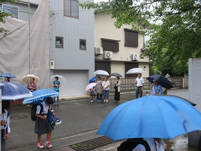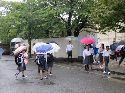 雨の朝となりましたが,あいさつ運動を行っています。