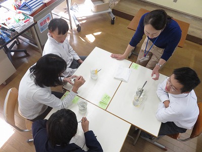 ビーカーに入った布の汚れが,洗剤によって落ちるようすを観察しました。