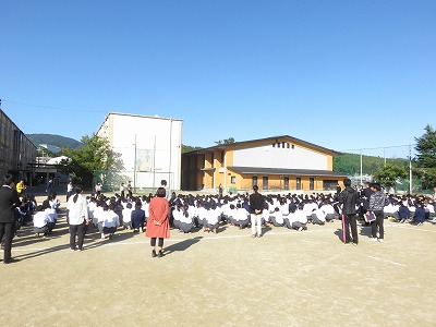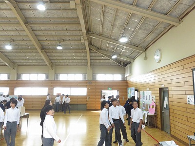 グランドで学習発表会の説明を聞いた後,展示鑑賞に入りました。
