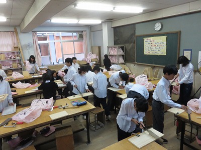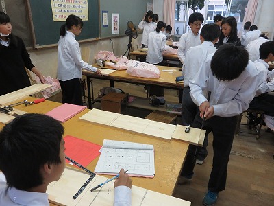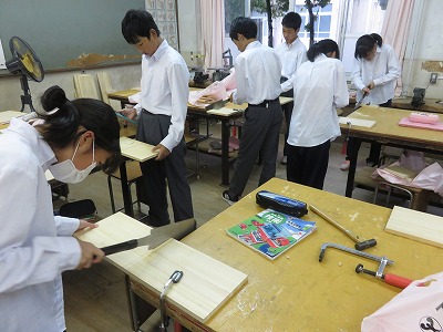 1年2組技術家庭科(技術分野)は,「両刃のこぎりを特徴を理解し,安全に使う」ことを目標に,けがきに沿って切断を行いました。
