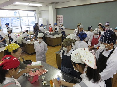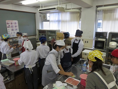 2年6組技術家庭科(家庭分野)は,「肉の調理上の性質を理解し,適切な火加減で調理することができる」ことを目標に,調理実習を行いました。