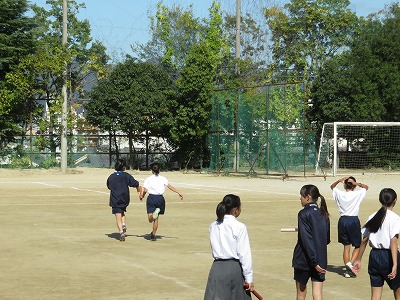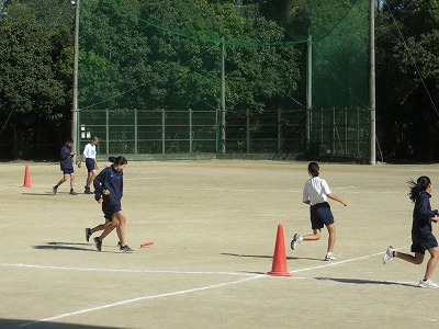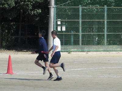 2年7組の保健体育は,時間ロスの少ないバトンパスについて考え,練習しました。