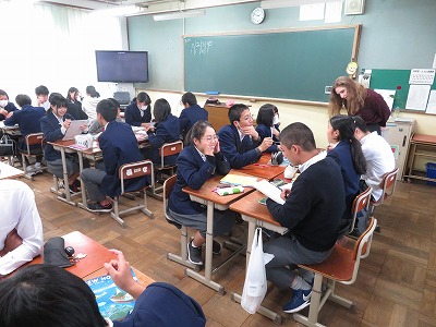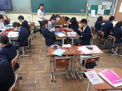 3年5組の英語は,日本語で出された不定詞の構文を英語で伝える活動をグループごとに行いました。