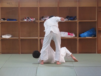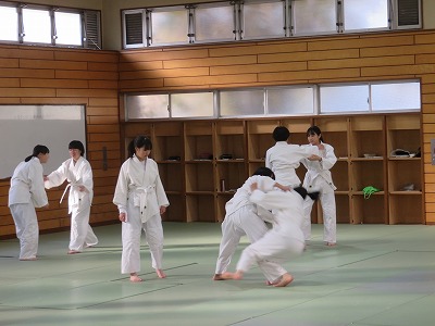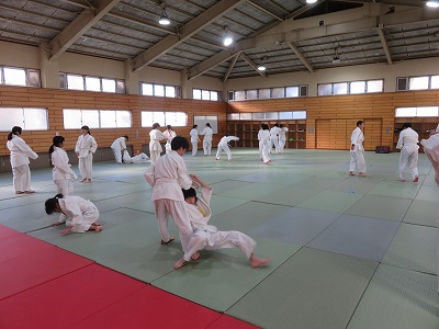 3年6組の保健体育は,格技室で柔道を行っています。今日の授業は,体落としとひさぐるまの実技テストを行いました。