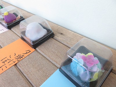 美術の授業で作成した1年生の絵文字を南校舎東側1階と2階の階段踊り場,3年生の紙粘土で作成した和菓子を教室前に展示しております。