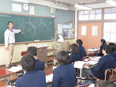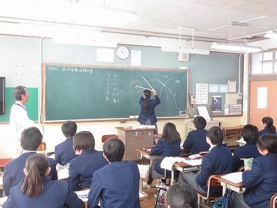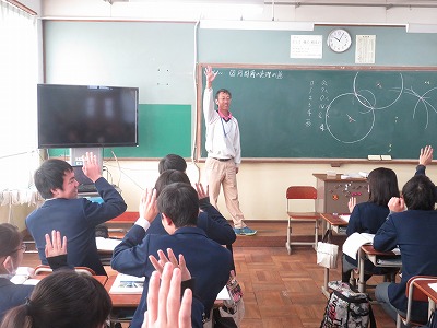 3年7組の数学は「円周角の定理の逆」について,学びを深めました。2つの点を通る円はいくつかけますか?3つの点を通る円はいくつかけますか?4つの点を通る円はいくつかけますか?との問いに生徒たちは真剣に向き合っていました。
