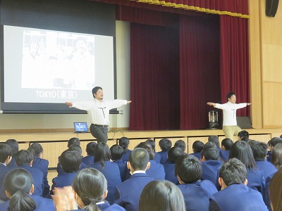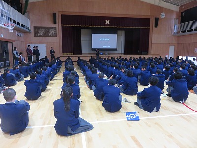 2年生学活は,最初の10分体育館で修学旅行のねらいと方面,実施日時について,発表しました。