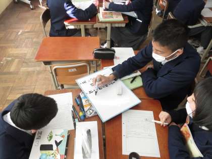 3年2組の国語は,入試問題の練習として菊池寛の『形』を読みました。彼が作品の中で伝えたかった”形”とは何か,仲間とともに考えました。