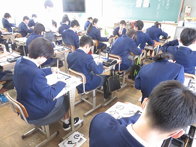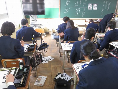 2年3組の国語(書写)は,「夕映えの空」を行書に書く課題に取り組んでいます。
