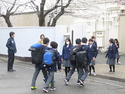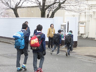 雪の降る中を「寒い寒い。」と言いながら登校する生徒がたくさんいました。