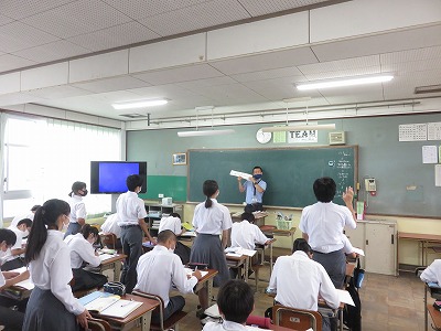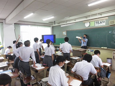 3年4組の英語のようすです。毎回,教員が提示する日本語文を英語で答えたり,英語の質問文に対し英語で回答する活動を行っています。