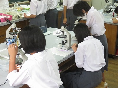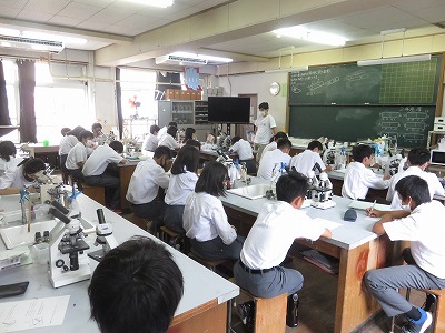 2年5組の理科は,タマネギの表皮細胞を顕微鏡で観察しました。その後,タマネギの表皮細胞と動物の細胞(今回は人の細胞をテレビを通して確認)とを比較し,その違いについて理解を深めました。