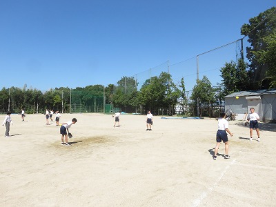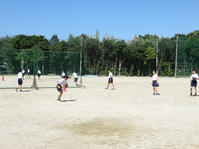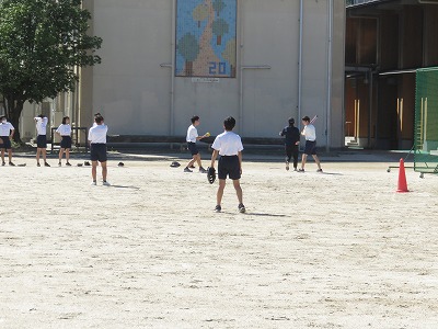 2年6組の保健体育は,ソフトボールに取り組んでいます。本時は基本練習の後,グループに分かれ,ゲームを行いました。