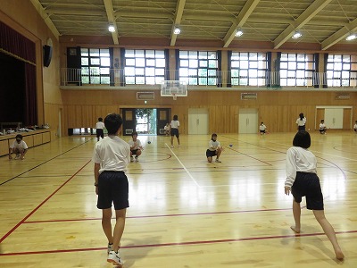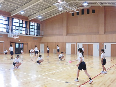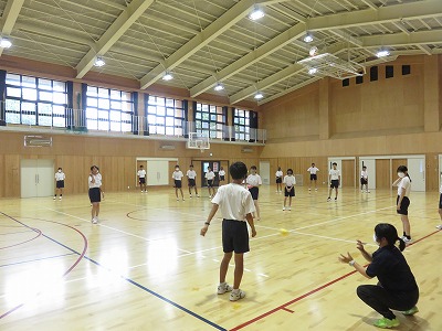 2年7組の保健体育は,ソフトボールに取り組んでいます。本日は,グランドの状態が悪いので,体育館でウインドミル投法の練習をしました。