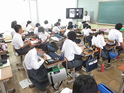 1年4組の国語は,行書の特徴を理解した上で,筆使いを意識して書写に取り組みました。
