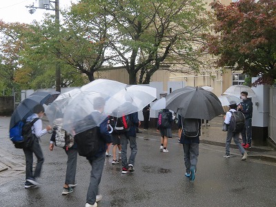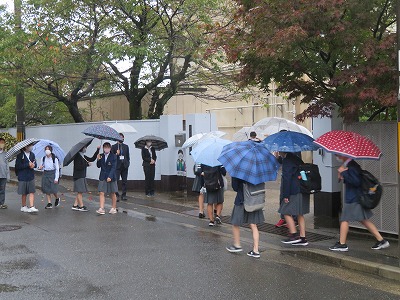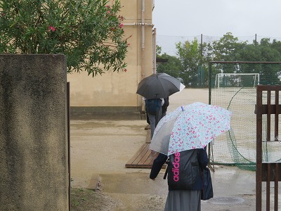 雨の朝となりました。校内の廊下が濡れ,滑りやすくなっています。十分注意するように指導します。