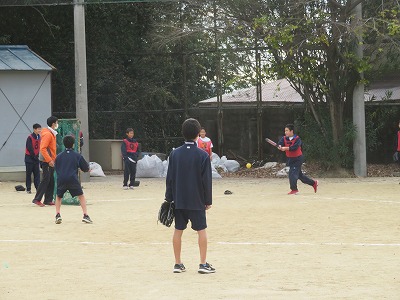 キャッチボール後,三角ベース形式でゲームを行いました。