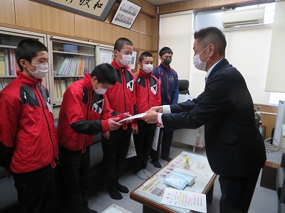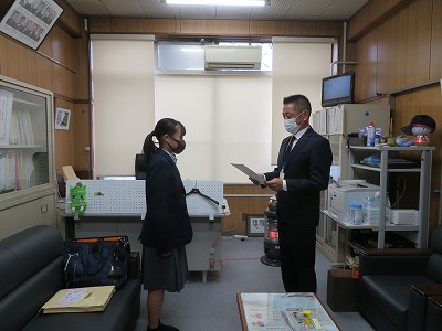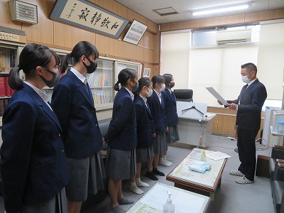 本来全校集会等で行う表彰については,コロナウイルス感染防止対策から持てないため,本日から校長室で5回に分けて行います。本日は,バドミントン,女子テニス,男子バレーボールの表彰を行いました。