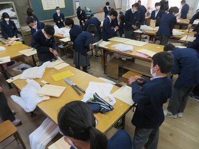 1年2組の技術・家庭科(技術分野)は,材料に引いた切断線に沿い,安全に留意して両刃のこぎりを使い,切断作業をしました。