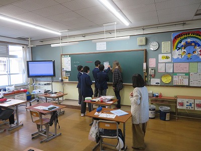 1組の英語は,ALTの先生とともに英語を使って福笑いに挑戦しました。