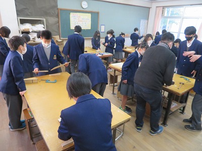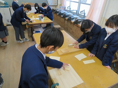 1年4組の技術・家庭科(技術分野)は,カンナを使い,安全に配慮しながら,仕上がり寸法線まで削りました。