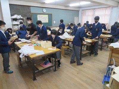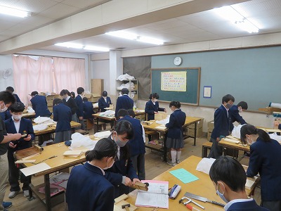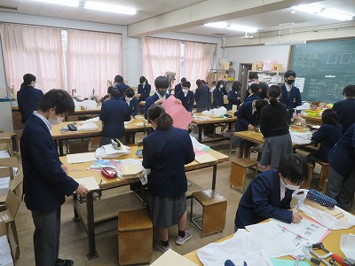 1年4組の技術・家庭科(技術分野)は,木材加工に挑戦しています。本時は,安全に十分注意して,両刃のこぎりでの切断と切断された材料をかんなで調整しました。