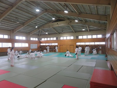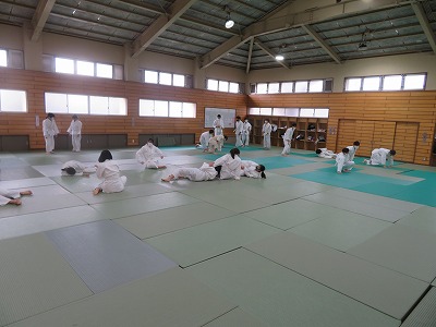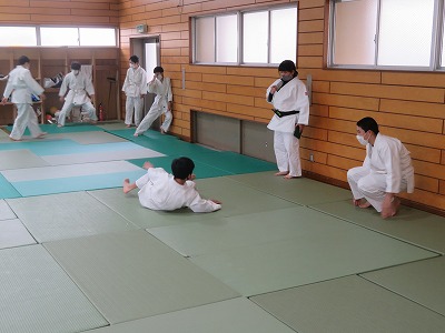2年6組の保健体育は,安全とコロナウイルス感染対策に配慮しつつ,柔道に取り組んでいます。本時は,これまで習得した体さばき,横受け身,前回り受け身のテストを実施しました。