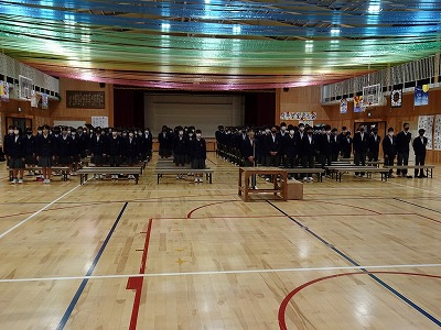 新型コロナウイルス感染対策のため,1,2年生は教室,3年生が体育館に入って行いました。