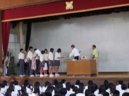 長かった夏休みも終わり,久しぶりに全校生徒が体育館に集まりました。部活動,勉強,旅行や友だちと遊んだり…みんな充実した夏休みを過ごしたようです。