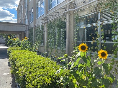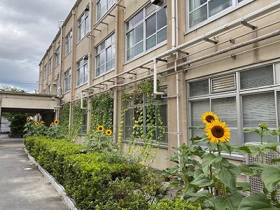 樫原中学校のヒマワリが,立秋を前に花をひらいてくれました。