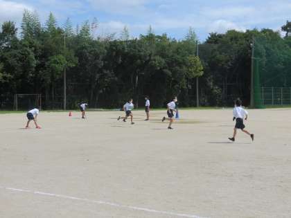 1年7組の保健体育は,バトンを渡すマークの位置を決める