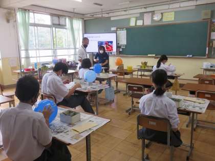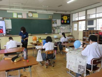 1組の美術は,風船や新聞紙を使って,お面制作の