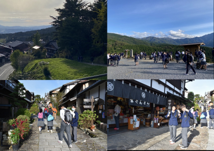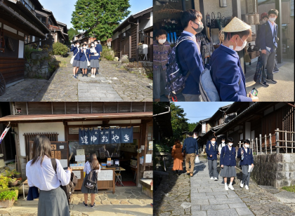 石畳が敷かれた坂に沿う宿場町「馬籠宿」に行き,班別