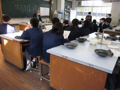 2年生が各クラス2時間ずつ,華道体験を行いました。華道についての知識などを学び,講師の方の実演を見た後,初めての華道を行いました。みんな楽しみながらも真剣にバランスなどを考え,花を活けていました。