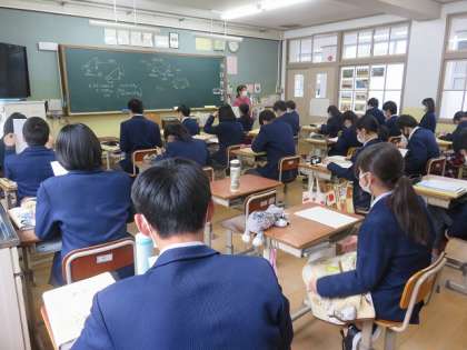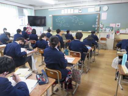 3年2組の数学は,相似な図形の応用問題に挑戦し,相似比を用いて実際の長さを求めることを目標に学習を進めました。