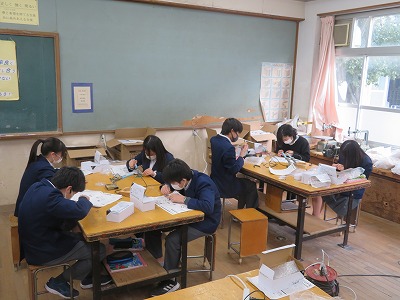 2年6組技術・家庭科(技術分野)は,基盤に部品をはんだ付けしました。高温になったはんだごてを火傷に注意しながら,一生懸命細かい作業に取り組みました。