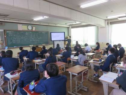 1年2組の数学は,立体がどのようにできているか考えることを目標に,動画を活用し,平面図形をどのように動かしたら立体ができるかを学習しました。