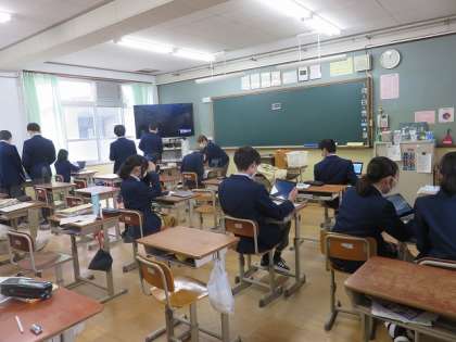 3年2組の数学は「標本調査」の単元を学習しました。GIGA端末を活用し,クラスの仲間とアンケート結果をまとめました。クラスのアンケート結果の傾向から,学年全体の結果を推測しました。このような方法の調査は身の回りにもありますね。