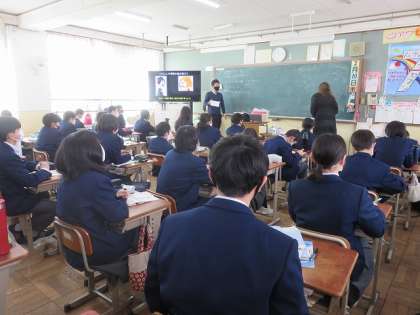 1年7組の英語は,英文のストーリーを読み,場面順に並べ替えることをしました。また,ALTの先生とストーリーの最後の場面を自分の考えたストーリーで英文に直す練習をしました。