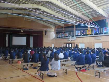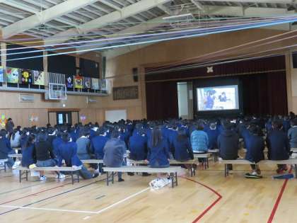 3年生を送る会が体育館でありました。本来なら全学年が顔を合わせて3年生を送るのですが,今年度もできませんでした。それでも1・2年生と生徒会本部がそれぞれ時間をかけて,準備した動画を体育館で流しました。3年生からも1.2年生に向けてのメッセージ動画がありました。動画を通して3年生に気持ちが伝わり,体育館中がとても温かな雰囲気に包まれていました。1・2年生,生徒会本部のみなさん,3年生のための準備,ありがとうございました。
