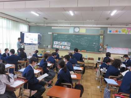 2年7組の英語は,教科書の登場人物「アサミ」のおじさんが,アサミとのやり取りの後,何を言ったかを文脈から読み取ることを目標に,クラスの仲間と考え,学習を進めました。