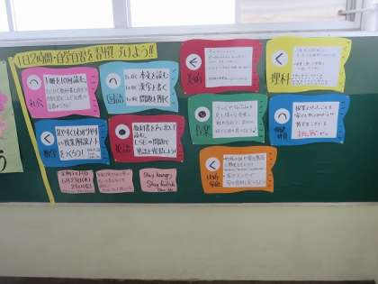 南校舎西側の階段に鯉のぼりの掲示物がありました。自学自習を習慣づけるうえでの,各教科のポイントが書かれています。それぞれのポイントを参考に各自で少しずつ学習を進めていってはどうでしょうか。