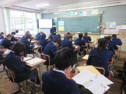 2年5組の数学は,文字式を利用して証明できることを目標に,全員で問題と証明の流れを確認し,それぞれ解く練習をしました。