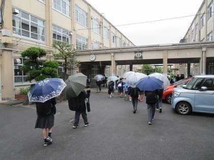 雨の朝となりました。廊下等,すべらないように教職員で声をかけていきます。