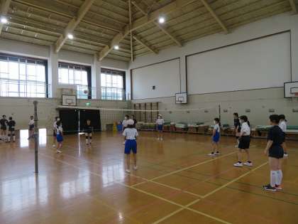 松陽小学校の体育館では女子バレーボール部が小学生と練習を行いました。アンダーハンドパスやオーバーハンドパス,スパイクの練習をしたあと,ゲームを行いました。児童のみなさん,今日の活動はどうでしたか?
