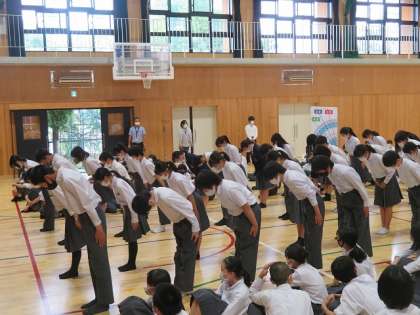 2年生の総合的な学習の時間は,京都すばる高校の先生と高校生に来ていただき,ビジネスマナー講演をしていただきました。お話をしていただいた後,チャレンジ体験に向けて,基本的な礼の角度などを学び,みんなで練習しました。京都すばる高校のみなさん,ありがとうございました。